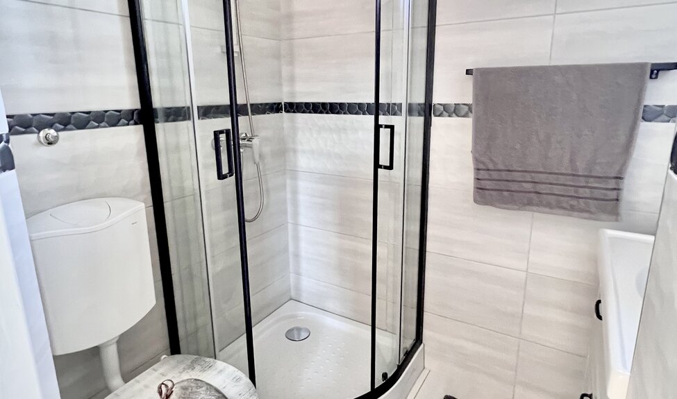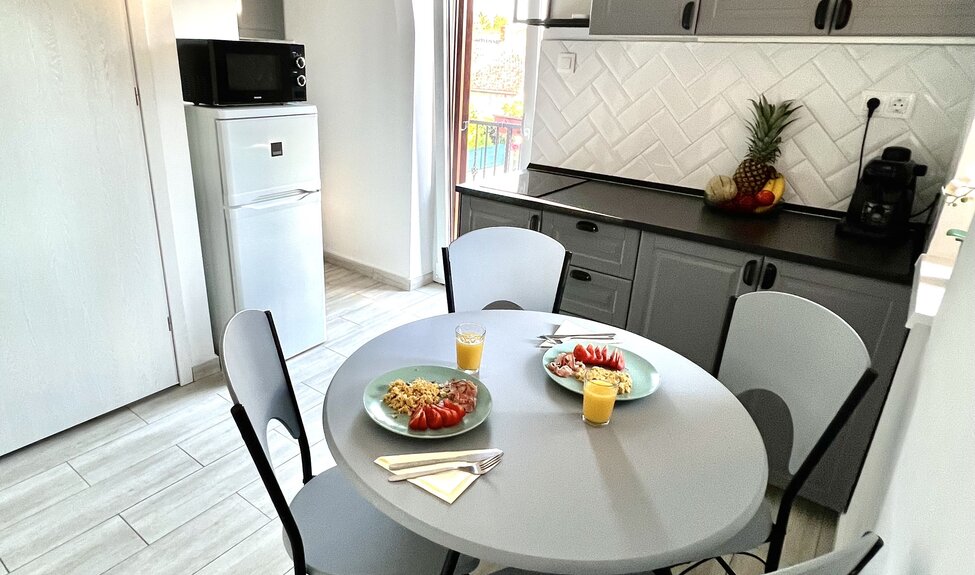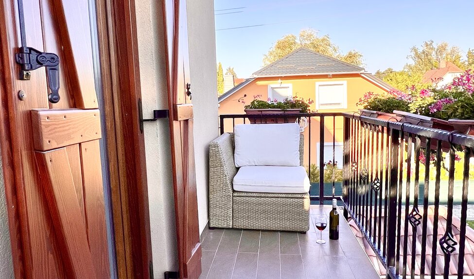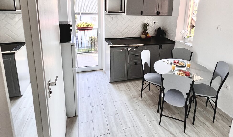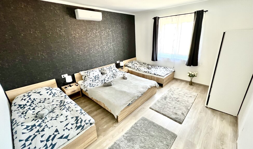 Emeleti egyszobás apartmanunkban 4 férőhely található (egy dupla és 2 szimpla ágyon elhelyezve). A konyhában rendelkezésre áll főzőlap, hűtő/fagyasztó, háztartási kisgépek a mellékelt felsorolás szerint. Erkélyes apartman, melynek erkélye az udvarra néz. Minden apartmanunk légkondícionált és tv-vel ellátott.